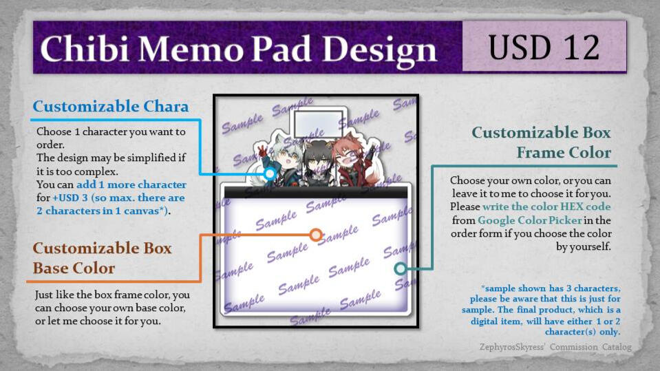When the artwork is done, a low-res, watermarked version will be sent for final approval. Minor revisions can be done at this stage (e.g. adding color filter, changing the base color and/or the frame color of the memo box, etc).