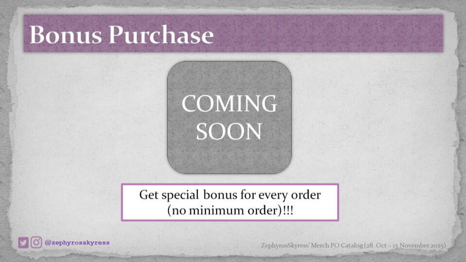 All items are Pre-Order items. Pre-Order period: 28 October - 13 November 2025 16.00 WIB. There are limited PO slots for the keychains, so the PO for the keychains may be closed before the PO period ends, once it reaches the production capacity. Powerbank only available for order using addresses within Java island. Production process is estimated to take about 1-2 month(s). Shipping is estimated will be around late December 2025 - early January 2026. Actual schedule may be different from expected ones. All related updates will be announced via X (formerly twitter) and instagram story.