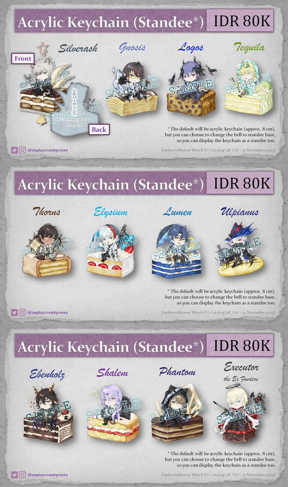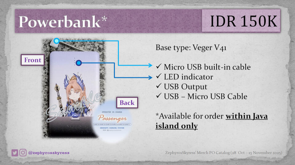 All items are Pre-Order items. Pre-Order period: 28 October - 13 November 2025 16.00 WIB. There are limited PO slots for the keychains, so the PO for the keychains may be closed before the PO period ends, once it reaches the production capacity. Powerbank only available for order using addresses within Java island. Production process is estimated to take about 1-2 month(s). Shipping is estimated will be around late December 2025 - early January 2026. Actual schedule may be different from expected ones. All related updates will be announced via X (formerly twitter) and instagram story.