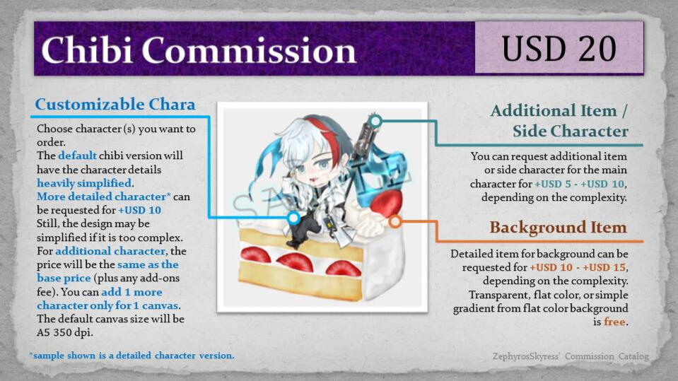 The final product will be digital file(s) only (there is no physical product, thus no shipping needed). The default canvas will be A4 landscape 350 dpi (A5 landscape 350 dpi for chibi commission only) and I may edit/crop it to fit the composition. If you have any preferable canvas size, please discuss it first before ordering.