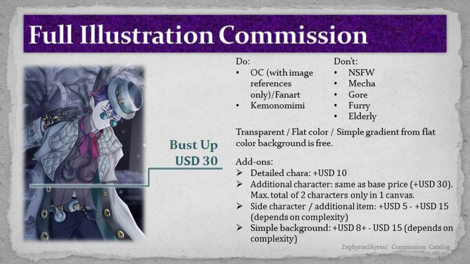 I do: OC (with image references only), fanart, kemonomimi. I don't do: NSFW, mecha, gore, furry, elderly. I have the right to decline a commission for any reasons.